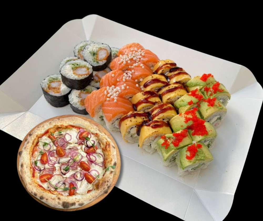 Вага 1580 г. Філадельфія з лососем ,Чіз рол гриль з манго,Кіото рол зі сніжним крабом, Футомаки з креветкою панко.Піца Реджина